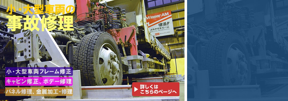 小型車両から大型車両まで車種・メーカー問わず対応可能であり、フレーム修正やボデー修理、キャビン交換等の事故修理や簡易塗装(eペイント)など、多くのメニューをご用意してお客様のニーズにお応えいたします。